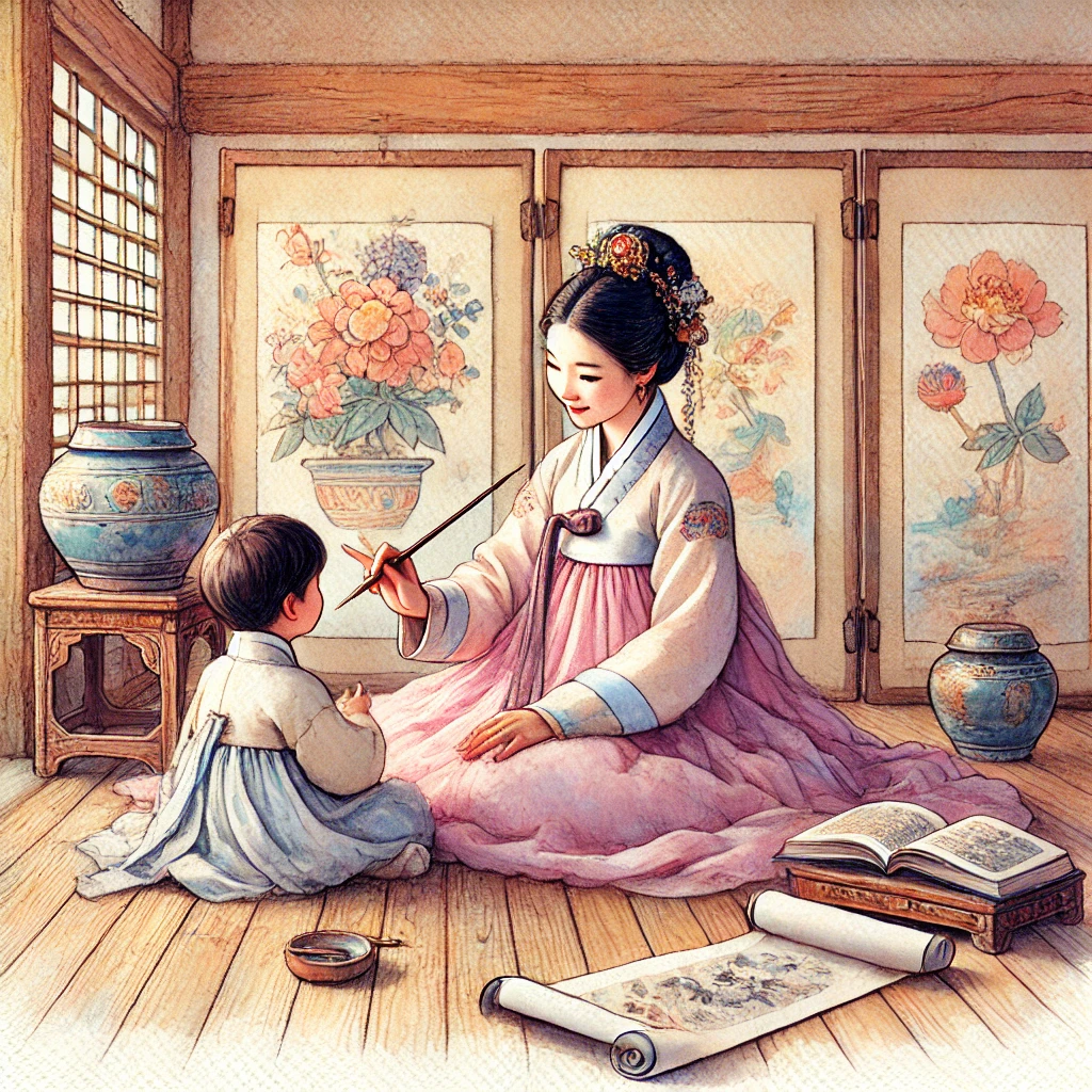 비록 공식적인 교육 기회는 제한적이었으나, 신사임당과 같은 지식인 가정의 여성들은 집안에서 자녀들에게 한문, 예절, 예술을 가르치는 데 중요한 역할을 했습니다. 신사임당이 아들 율곡 이이를 현명하게 키운 것도 이러한 맥락과 연결됩니다.